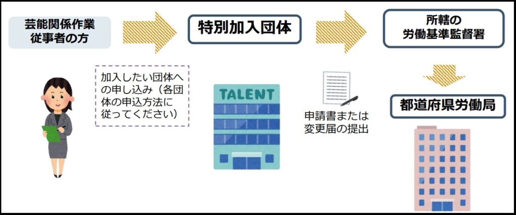 A 既に芸能関係作業の特別加入団体として承認をされた団体を通じて、または新規に芸能関係作業の特別加入団体を設立して、加入申請書等を所轄の労働基準監督署長を経由して都道府県労働局長に提出してください。